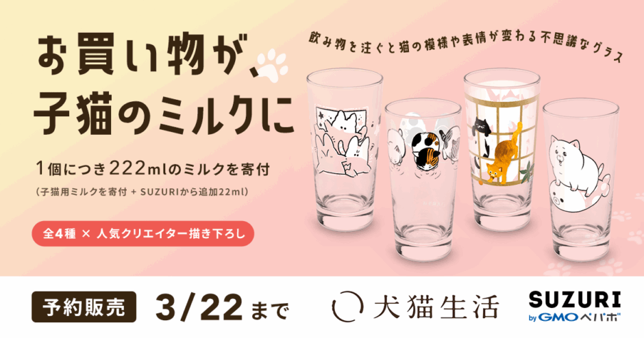 「犬猫生活 猫の日チャリティ2026」の一環として、SUZURIで活躍する人気クリエイター4名が描き下ろしたオリジナルデザインのキャットカップロンググラスが販売中です。